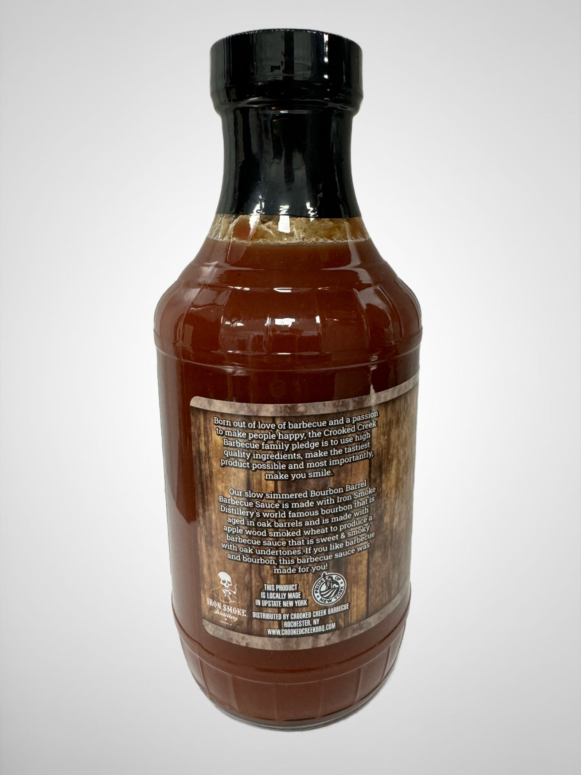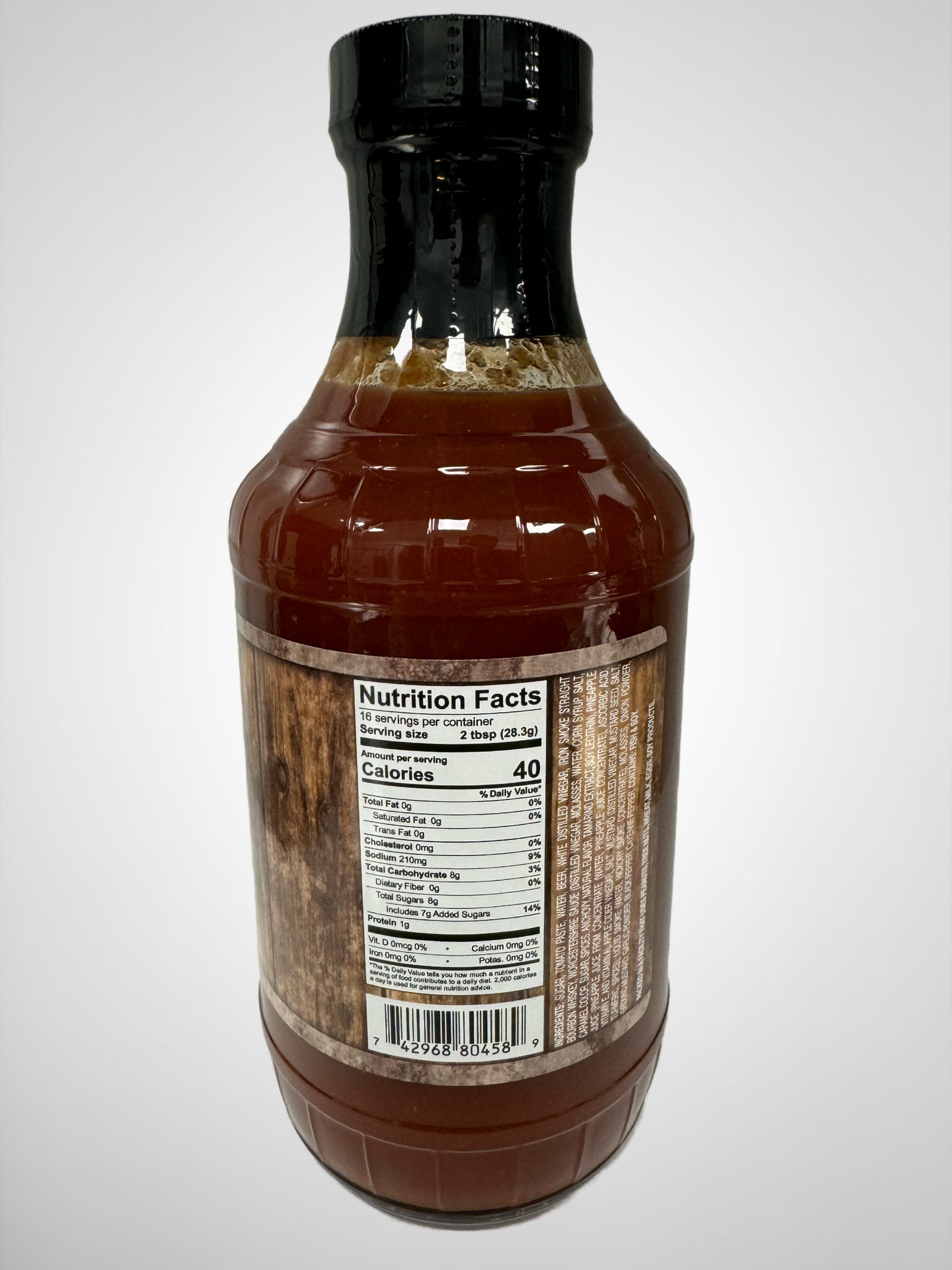 Sugar, Tomato Paste, Water, Beer, White Distilled Vinegar, Iron Smoke Straight Bourbon Whiskey, Worcestershire Sauce (Distilled Vinegar, Molasses, Water, Corn Syrup, Salt, Caramel Color, Sugar, Spices, Anchovy, Natural Flavor, Tamarind Extract, Soy Lecithin), Pineapple Juice (Pineapple Juice from Concentrate (Water, Pineapple Juice Concentrate), Ascorbic Acid, Vitamin E, and Vitamin A), Apple Cider Vinegar, Salt, Mustard (Distilled Vinegar, Mustard Seed, Salt, Turmeric, Spices), Liquid Smoke (Water, Hickory Smoke Concentrate), Molasses, Onion Powder, Ground Mustard, Garlic Powder, Black Pepper, Cayenne Pepper & Xanthan gum.